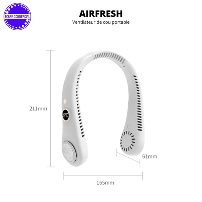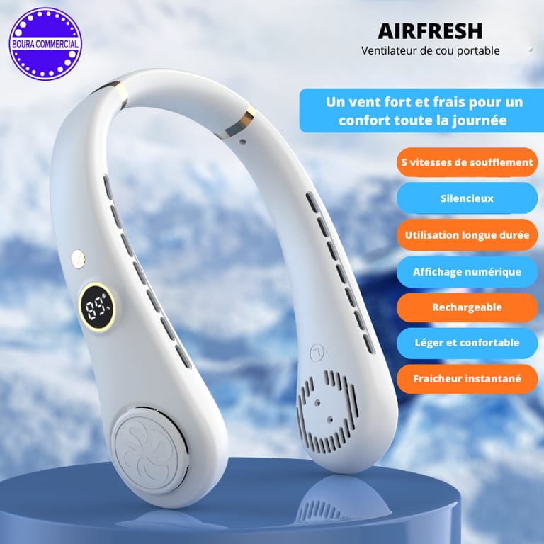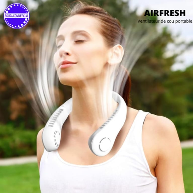 Affrontez la chaleur en toute liberté avec Airfresh, le ventilateur de cou nouvelle génération conçu pour offrir une fraîcheur continue sans effort. Grâce à son design ergonomique mains libres, il diffuse un flux d’air puissant et homogène autour du cou, vous permettant de rester au frais tout en gardant une totale liberté de mouvement.
